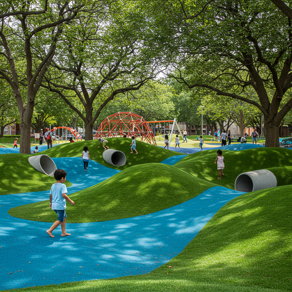 Levy Park is a hidden gem with a playground that’s all about creativity and fun. Its unique design includes climbing structures, swings, and a splash pad. Plus, with regular community events, there’s always something exciting happening here.